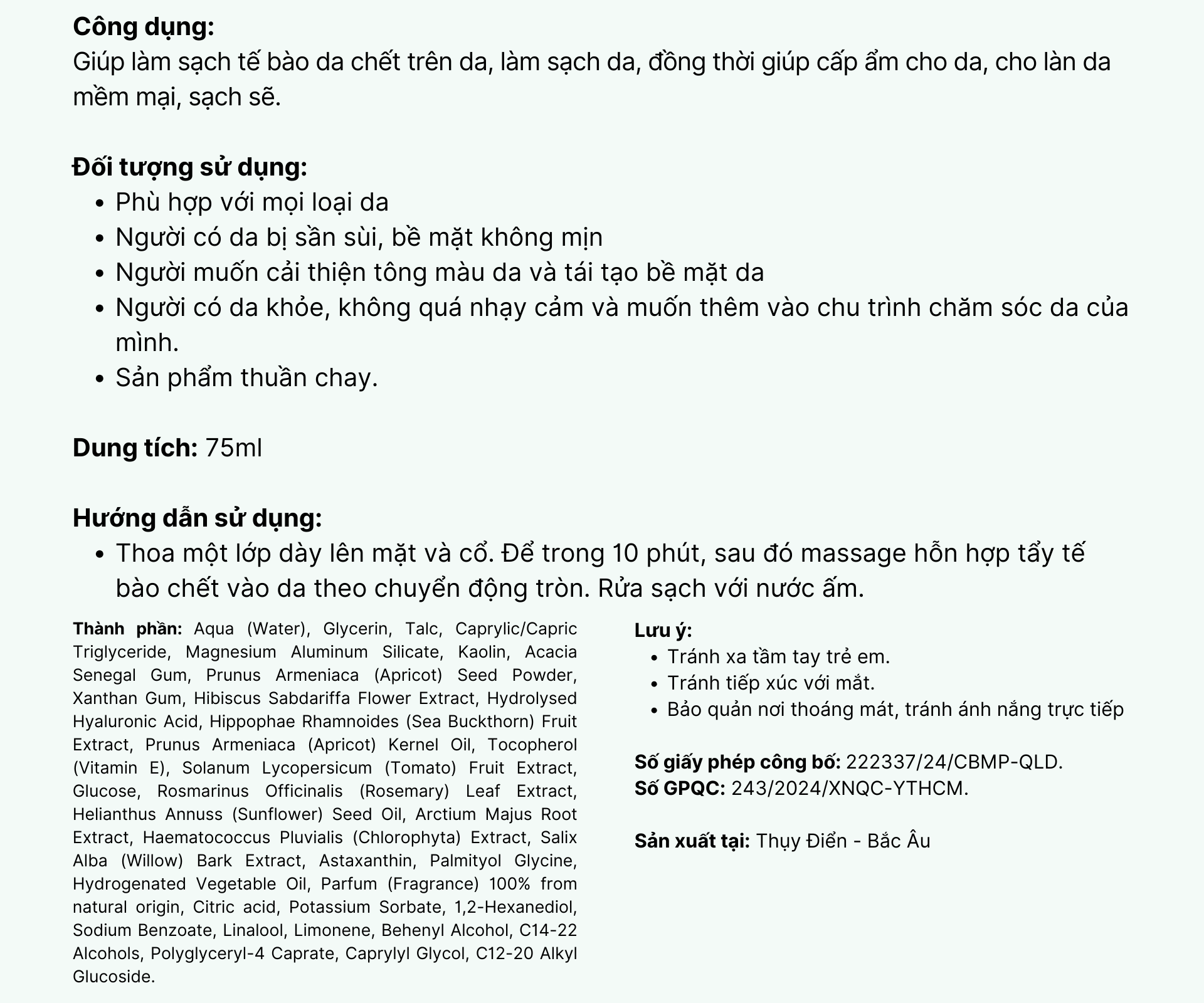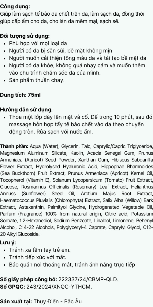 - Sản phẩm tẩy tế bào chết cho da mặt với hương thảo dược, chứa nhiều loại thảo dược, bao gồm hoa bụt giấm và hạt mơ, có giúp hỗ trợ tái tạo tế bào và phục hồi làn da một cách tự nhiên.
