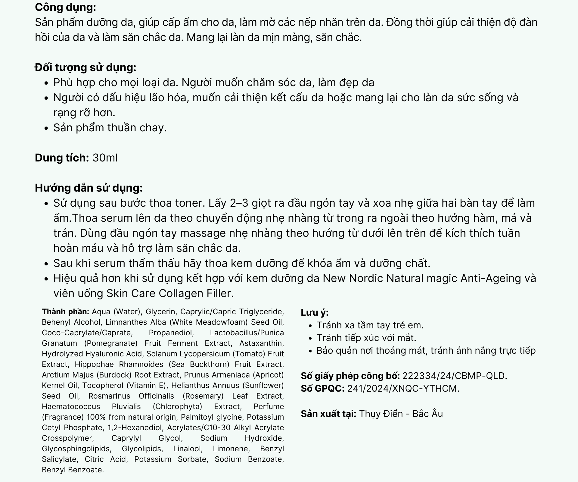 - Kết cấu nhẹ, thẩm thấu nhanh, sản phẩm thẩm thấu vào các lớp da và cung cấp các thành phần hoạt tính giúp tăng cường sản xuất collagen, giữ ẩm và cải thiện độ săn chắc của da – tất cả đều có sức mạnh từ thiên nhiên.